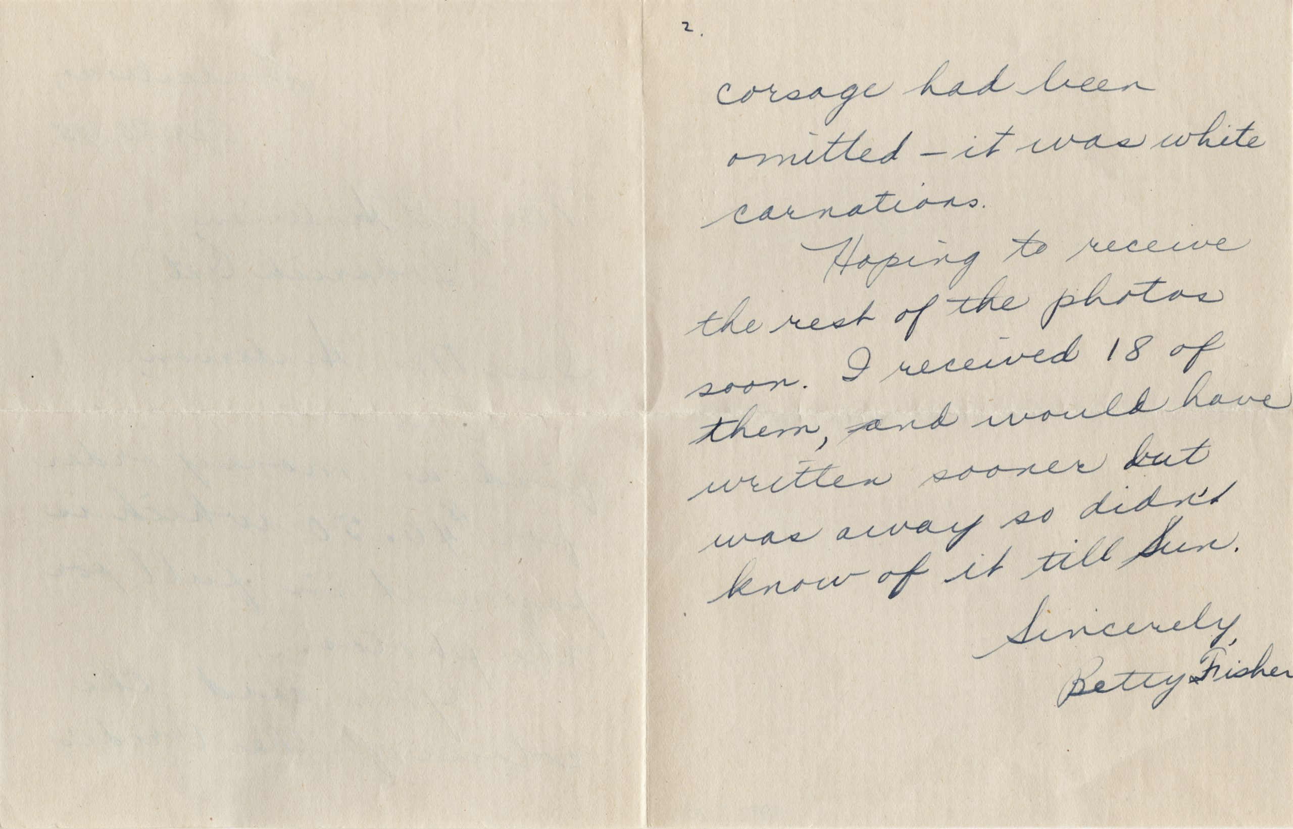 Front side of letter to Mr. J. G. Henderson from Betty Fisher, April 30, 1945. Letter sending payment and advising of corsage colour.