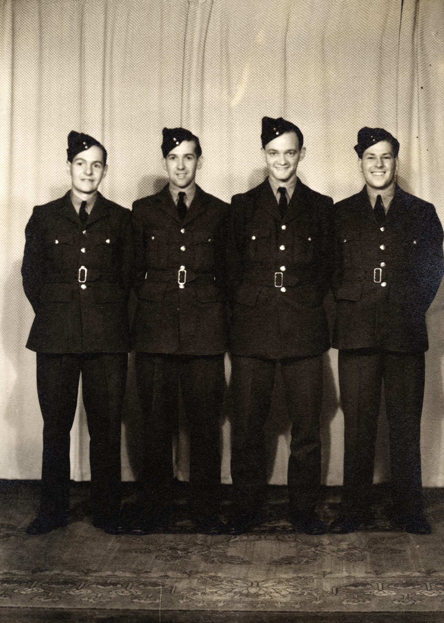 Black and white mid shot portrait of four men in RAF or RCAF uniforms. They are all turned and their bodies are facing right. On their arms are RCAF or RAF Eagle Shoulder Flashes and RCAF or RAF Wireless Operator badges. There are two copies of the photograph with different exposures (labelled a - b)